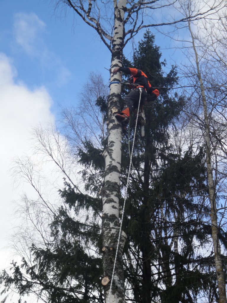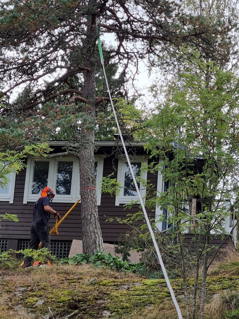 Vi fäller träd i skog, på gård och bredvid hus eller annan bebyggelse. På mera utmanande kan vi fälla från toppen i mindre bitar.
